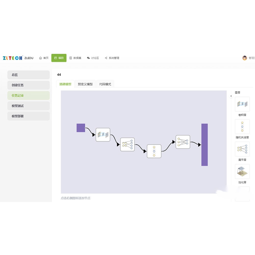 智龍可視化算法平臺可實(shí)現(xiàn)數(shù)據(jù)采集、數(shù)據(jù)清洗、數(shù)據(jù)標(biāo)注、模型設(shè)計(jì)、模型訓(xùn)練、模型部署等全流程的交互式、可視化操作。采用BS架構(gòu),用戶通過瀏覽器即可進(jìn)行人工智能學(xué)習(xí)。