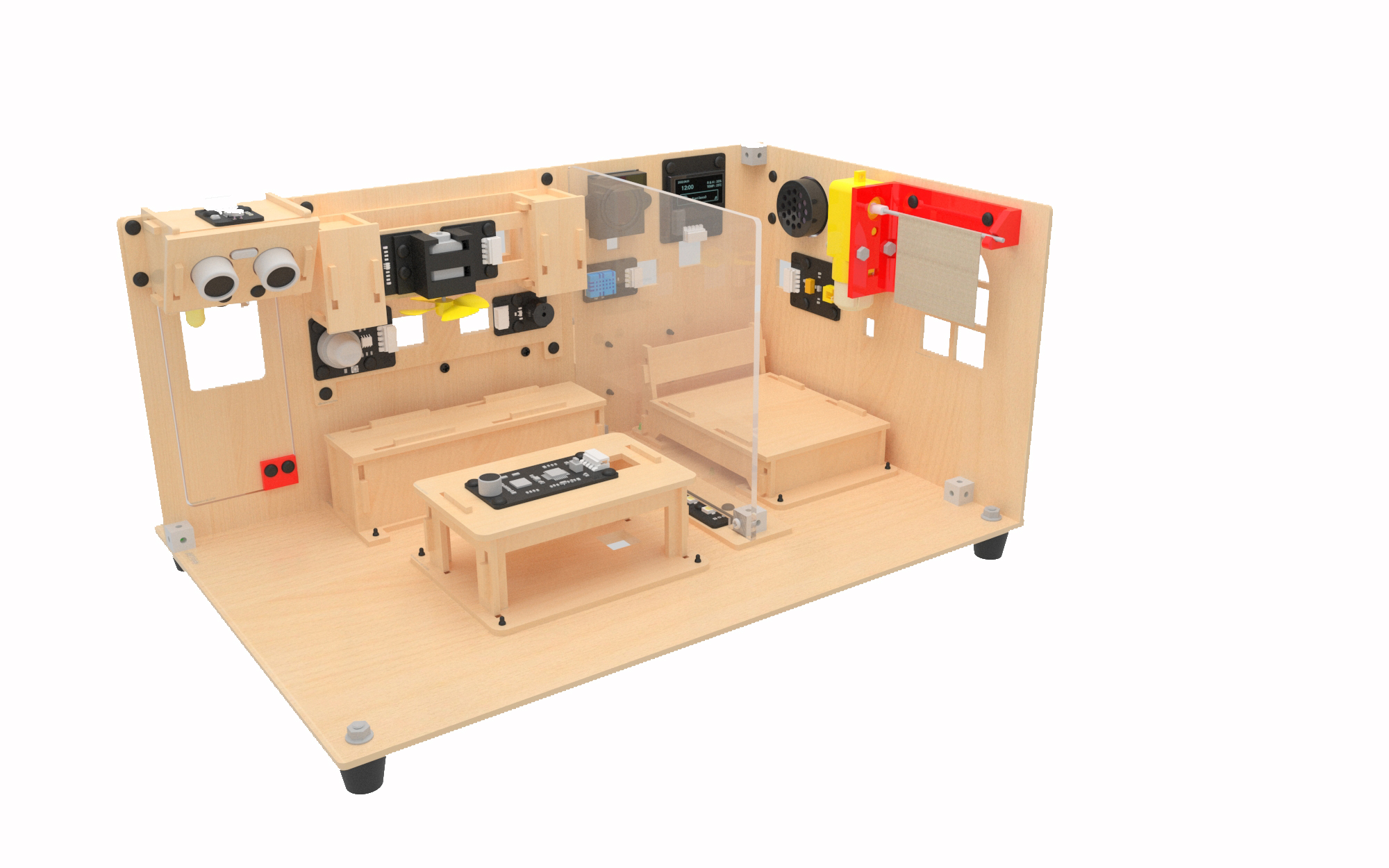 1、AI智能家居教學(xué)套件由AI主控板、擴(kuò)展板、傳感器與智能家居結(jié)構(gòu)套裝所組成,整體的AI智能家居結(jié)構(gòu)由各個(gè)AI功能模塊所組成,模塊項(xiàng)目之間相互獨(dú)立,可進(jìn)行模塊化項(xiàng)目式拆裝,整體場景可實(shí)現(xiàn)人工智能語音交互控制、物聯(lián)網(wǎng)手機(jī)APP通過WIFI進(jìn)行遠(yuǎn)程控制,以及人體交互感應(yīng)控制等功能,套件所含的所有傳感器可整體同時(shí)一起連接在1塊主板上進(jìn)行功能實(shí)現(xiàn)。