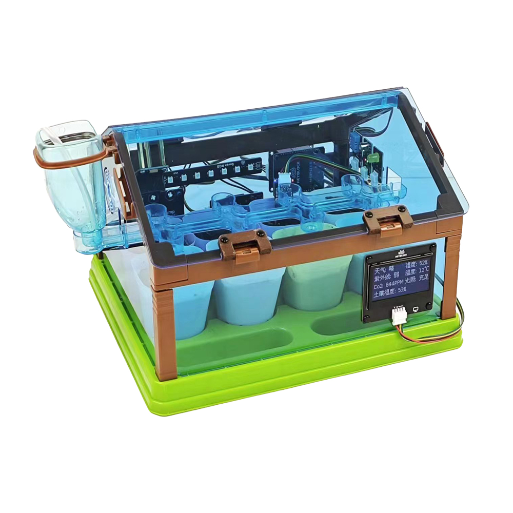 2、AI智慧農場可根據圖形化編程可實現相應的功能:第一,農場環境檢測功能,包括CO2、土壤濕度、光照強度、溫度、濕度、雨水等環境參數監測,同時還能一起將環境參數實時顯示在2.4寸OLED屏幕上;第二,能根據土壤濕度檢測的數值參數進行自動滴灌補水、根據光照強度進行室內自動不光、根據室內濕度情況進行自動排風等功能;第三,AI智慧農場還可利用手機APP進行遠程交互控制,包括在手機APP查看當前農場環境參數,并利用手機APP對農場進行相應的功能控制,包括補光、補水、排風等。